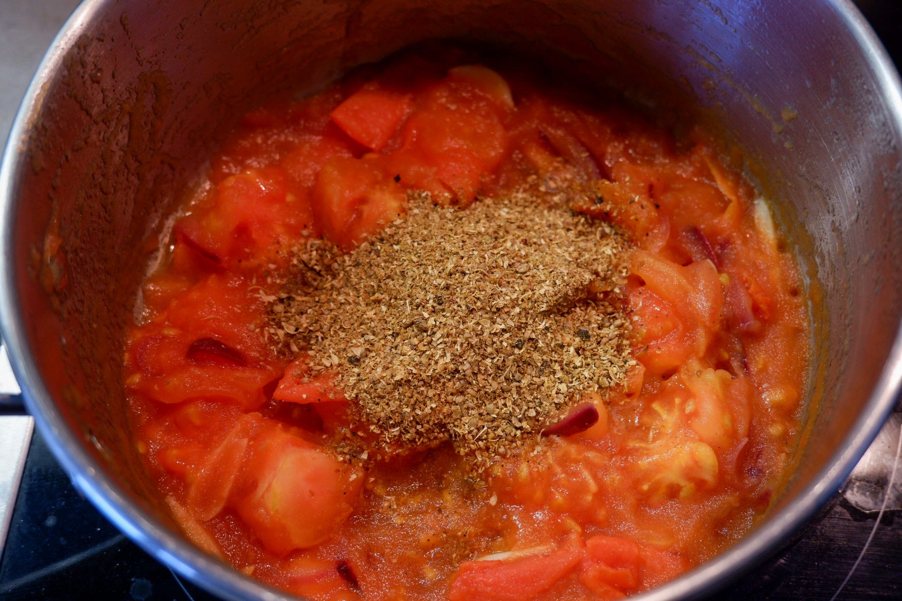 Add in the garlic and tomatoes. Cook until the tomatoes are soft to mash. Mash the tomatoes.